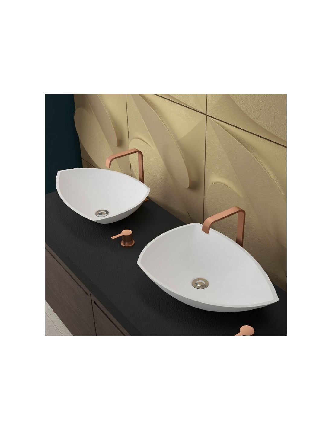 Un lavabo sobre encimera con una forma semiorgánica y alargada, para dar ese toque de elegancia que estamos buscando para nuestro cuarto de baño. Con una forma simple pero elegante es ideal para aquellos baños contemporáneos done se quiere dar un toque diferenciador. Fabricado en SurfacePlus (SolidSurface) un material que se caracteriza por su blanco puro y tacto natural a las piedras naturales.