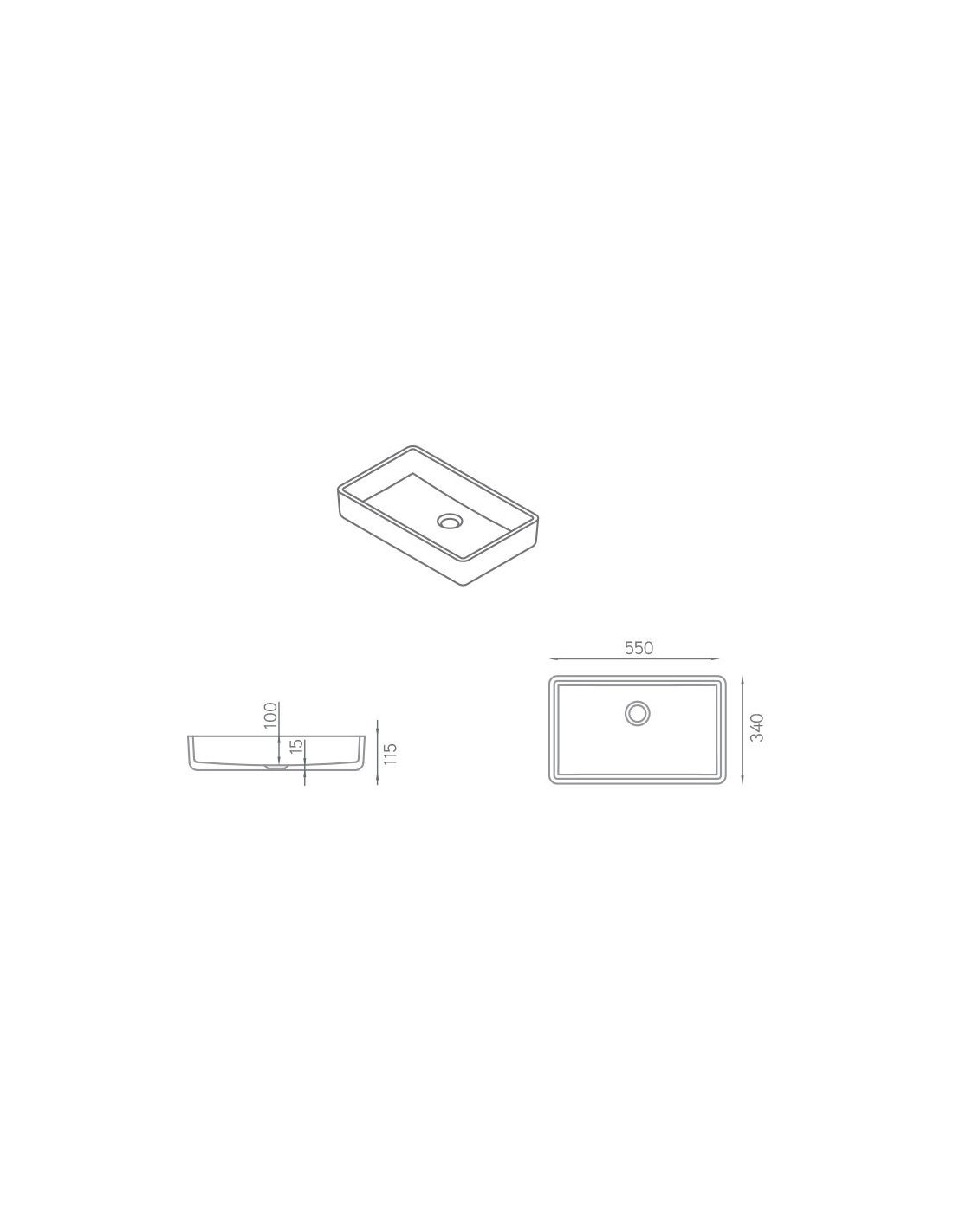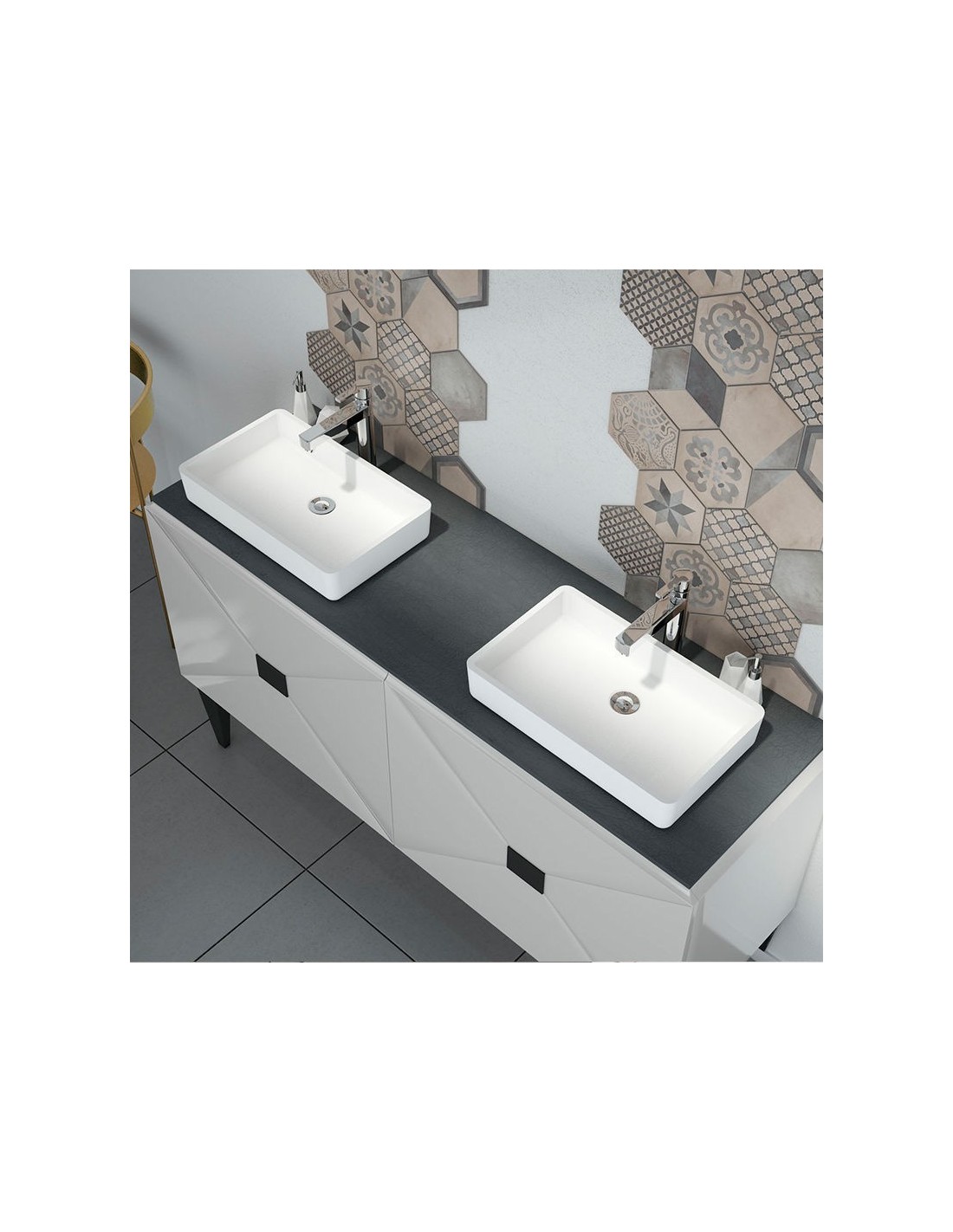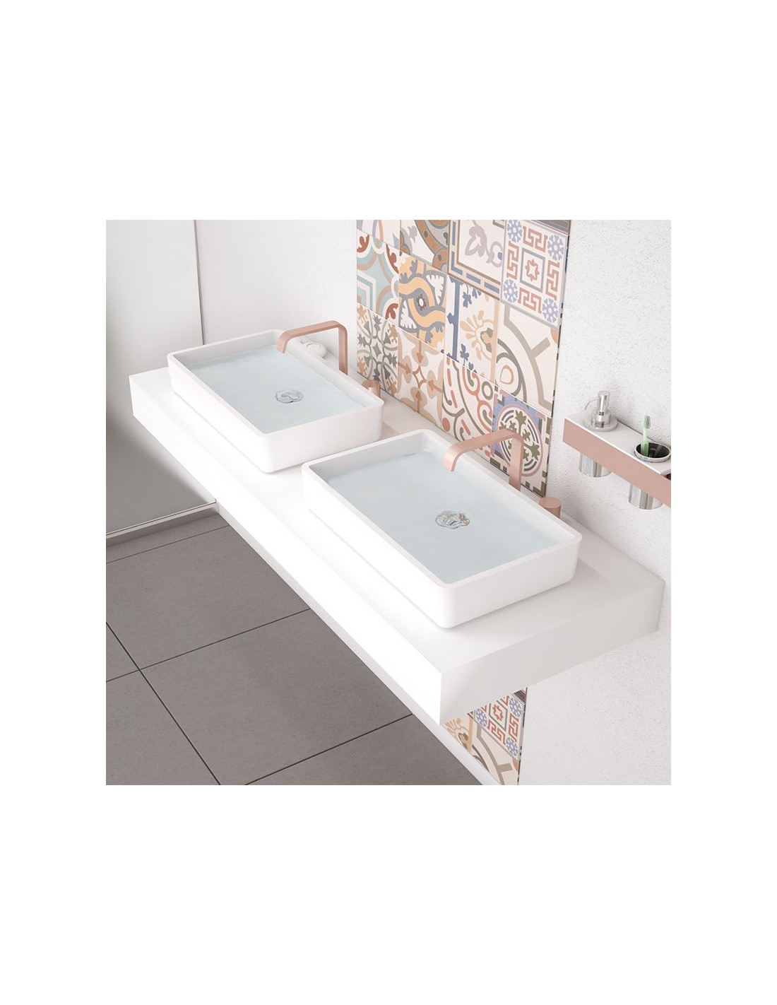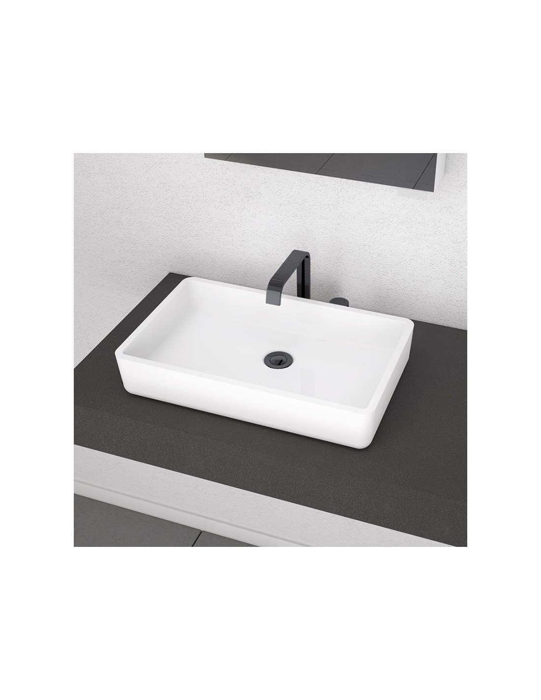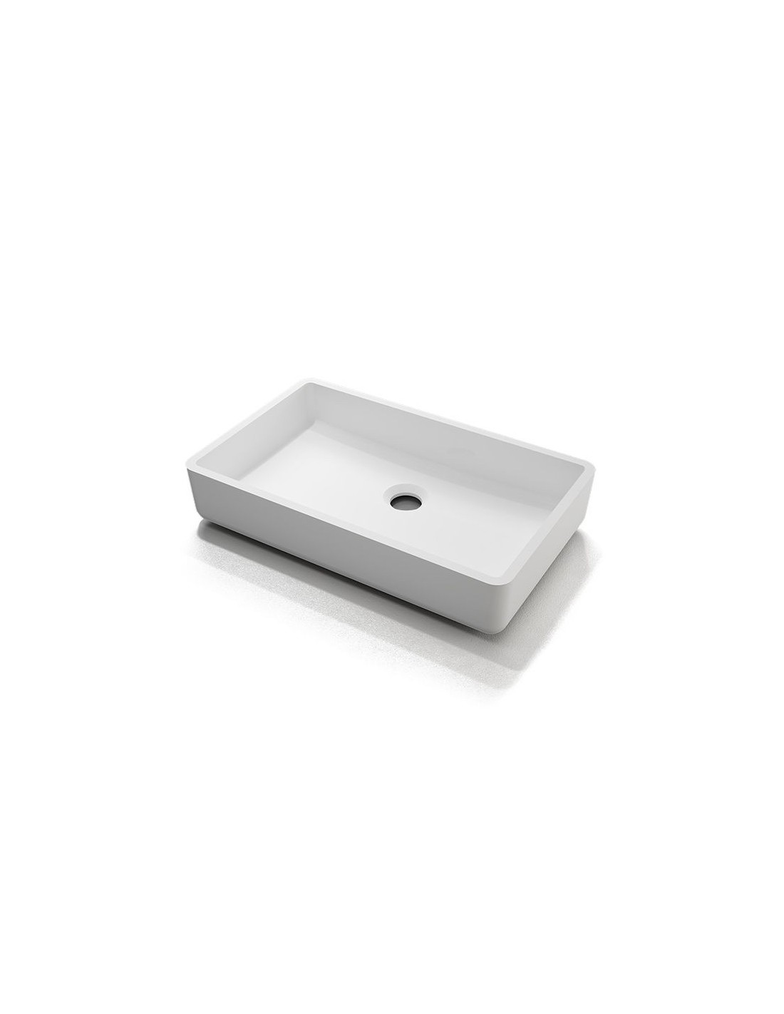 Un lavabo sobre encimera rectangular, con altas prestaciones que encaja muy bien en cualquier tipo de cuarto de baño. Un diseño pensado para ofrecer la mayor funcionalidad con un acabado blanco puro, característico del material por el que está formado, SurfacePlus (SolidSurface), de gran proyección en el mundo del baño.