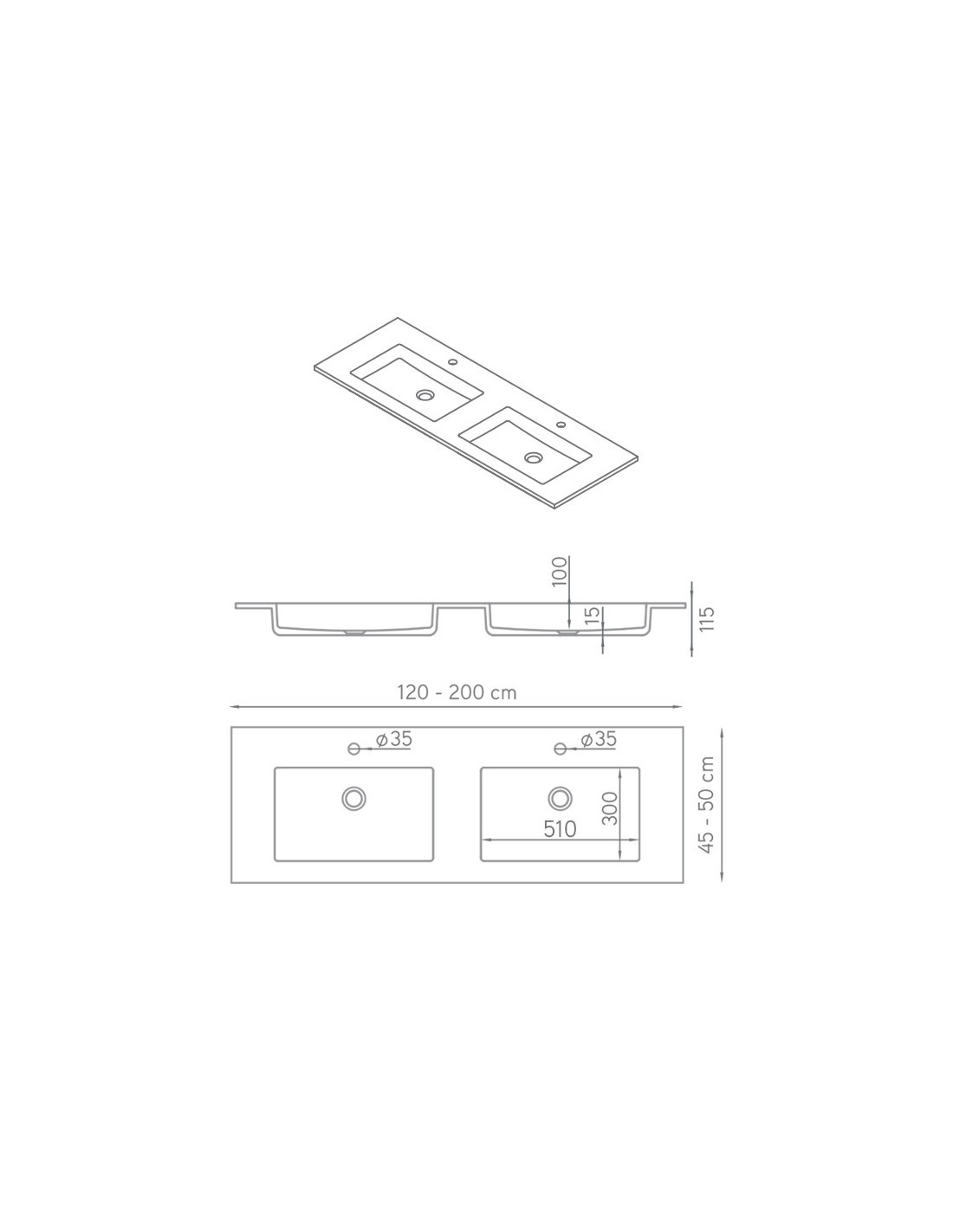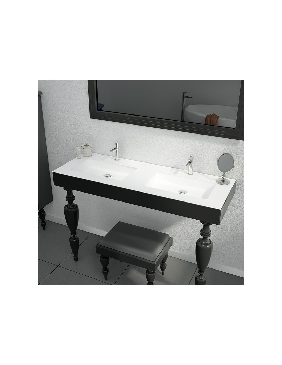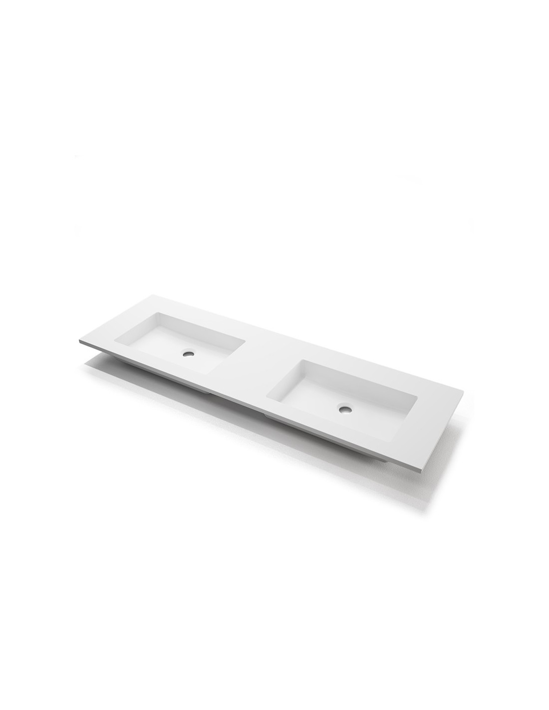 Lavabo doble con encimera. Senos rectangulares AlfaPlus. Fabricado en SurfacePlus, un material de alta calidad con acabados en color blanco y textura lisa. Montaje sobre mueble.