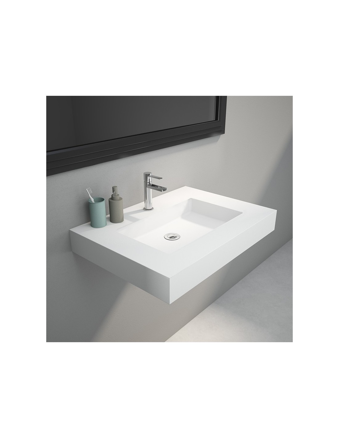 Lavabo suspendido compuesto por un seno AlfaPlus y un faldón inferior. El material de alta calidad SurfacePlus le aporta el color blanco puero y su textura sedosa y suave. Lavabo rectangular, de forma geométrica y de estilo moderno.