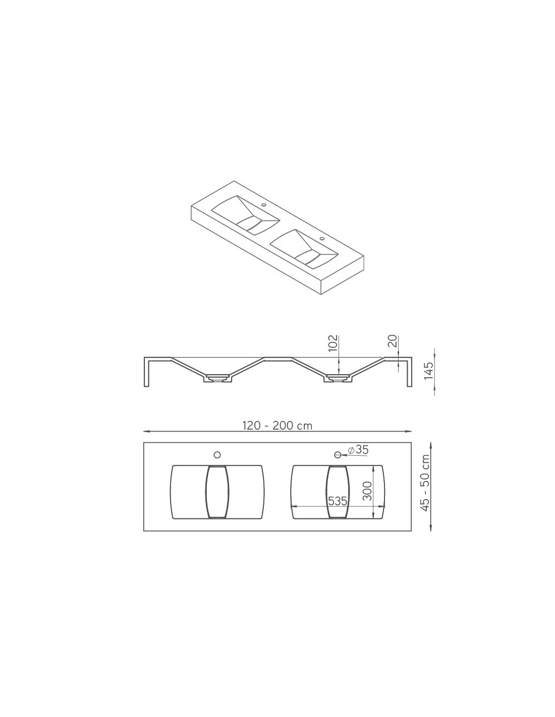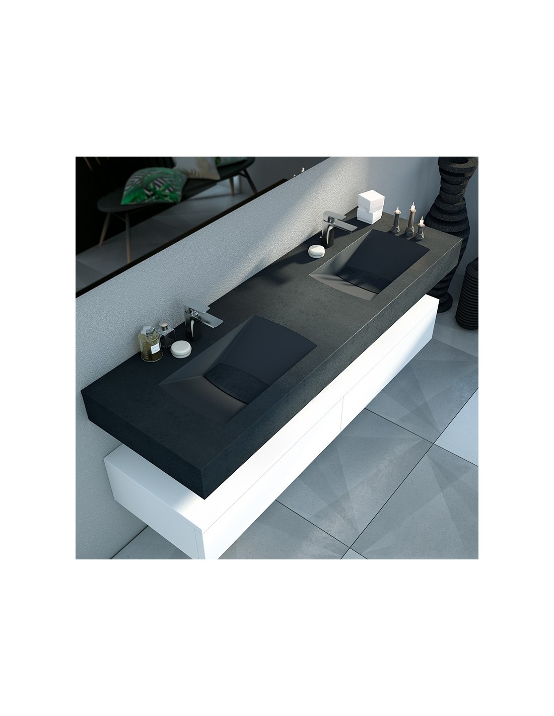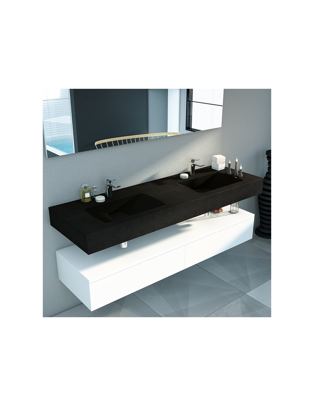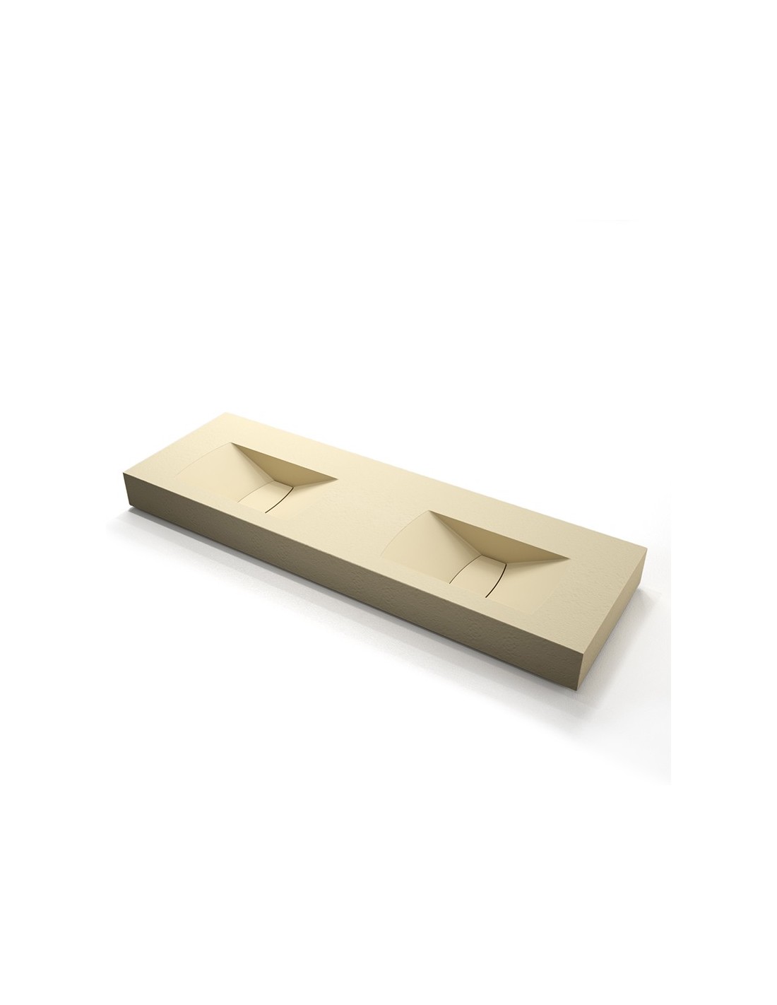 Lavabo doble seno con encimera y faldón inferior para ocultar los anclajes a pared. Disponible en varias medidas, colores y texturas. Rejilla integrada. Montaje de lavabo suspendido. Fabricación en St-one.