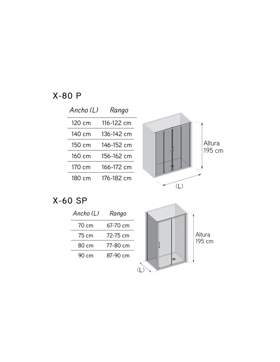 Combinación entre el modelos de mampara de ducha estándar X-80P y el fijo de ducha en ángulo X-60SP. Su perfilería tiene un acabado cromo y el vidrio puede ser transparente o a elegir entre tres serigrafías: Band, Band 2 y Medium. Está fabricado en su totalidad con vidrio templado de 6 mm, y su diseño es reversible, es decir, se puede instalar tanto a la derecha como a la izquierdas de la mampara de ducha.