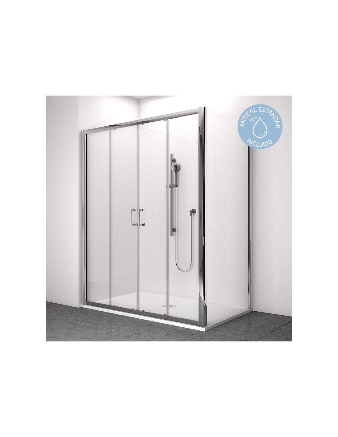 Mampara de ducha estándar X-80P con doble puerta y fijos en línea combinada con el fijo de ducha en ángulo X-60SP. Su posición es reversible, con perfilería en cromo y acabados en transparente o serigrafía. Antical estándar incluido.