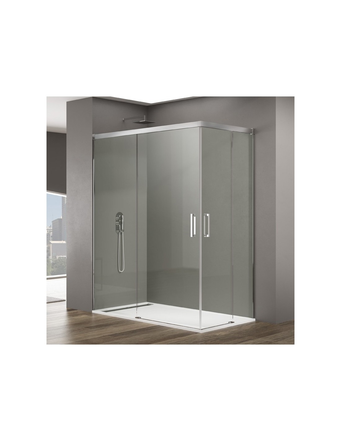 Mampara de ducha BASIC angular al vértice está disponible en todas las medidas con vidrios de 6 mm. Sin perfilería inferior y con Antical Estándar incluido.
