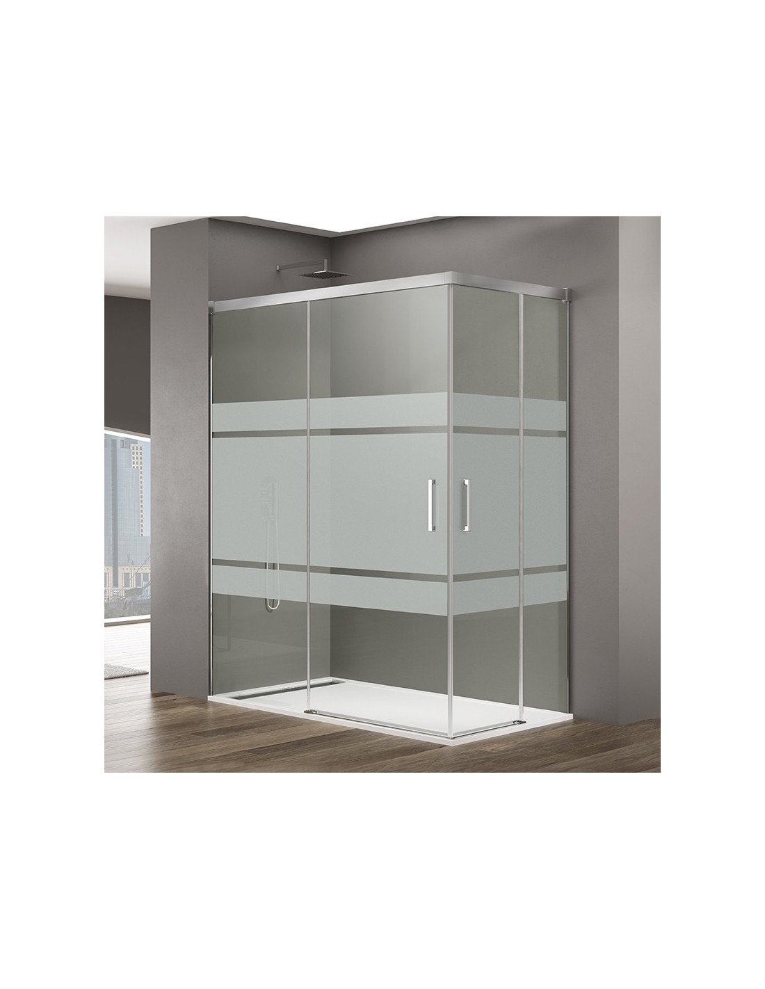 El modelo BASIC angular al vértice, está compuesto por 2 puerta corredera con apertura en vértice de 6 mm + 2 fijo de ducha en los extremos de 6 mm. Este modelo cuenta con perfiles de aluminio, tratándose de un angular con una apertura desde su vértice. Además, es un modelo sin perfilería inferior. Viene incluido el Antical Estándar y puede personalizarse con la serigrafía Frost Plus.