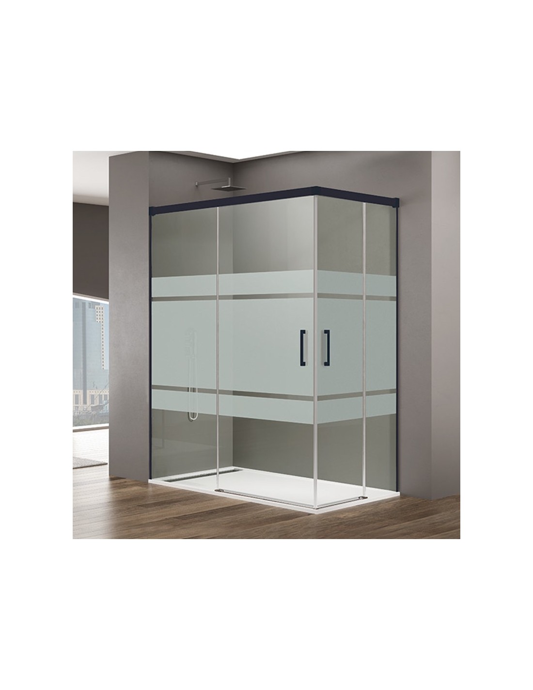 El modelo BASIC angular al vértice, está compuesto por 2 puerta corredera con apertura en vértice de 6 mm + 2 fijo de ducha en los extremos de 6 mm. Este modelo cuenta con perfiles en Negro mate, tratándose de un angular con una apertura desde su vértice. Además, es un modelo sin perfilería inferior. Viene incluido el Antical Estándar y puede personalizarse con la serigrafía Frost Plus.