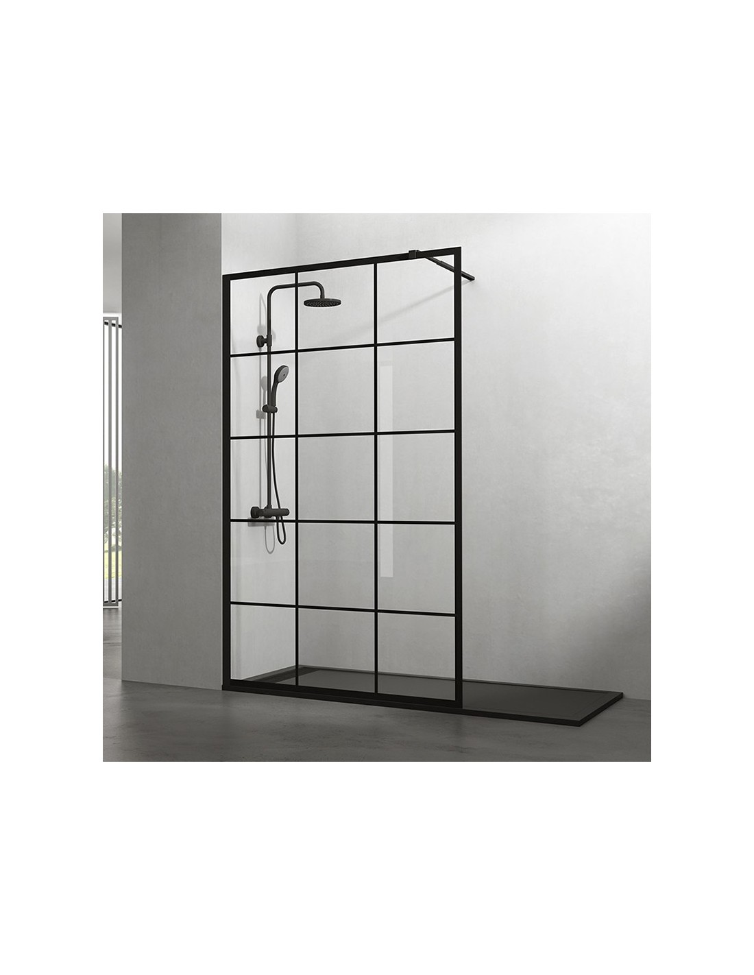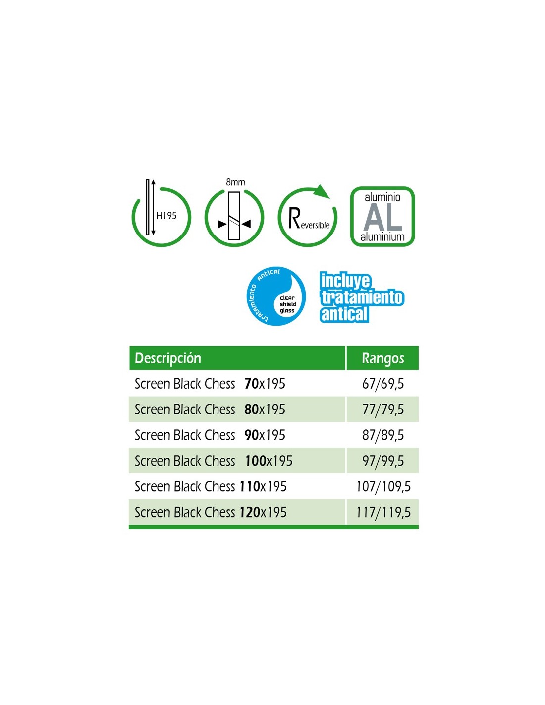 El modelo SCREEN BLACK CHESS es un fijo de ducha compuesta por un vidrio fijo de 8 mm. Es un fijo de ducha simple pero funcional, que incorpora perfilería en Negro mate. Este fijo cuenta con un nuevo decorado que ha sido referente en las principales ferias internacionales dentro de esta tipología de mampara.