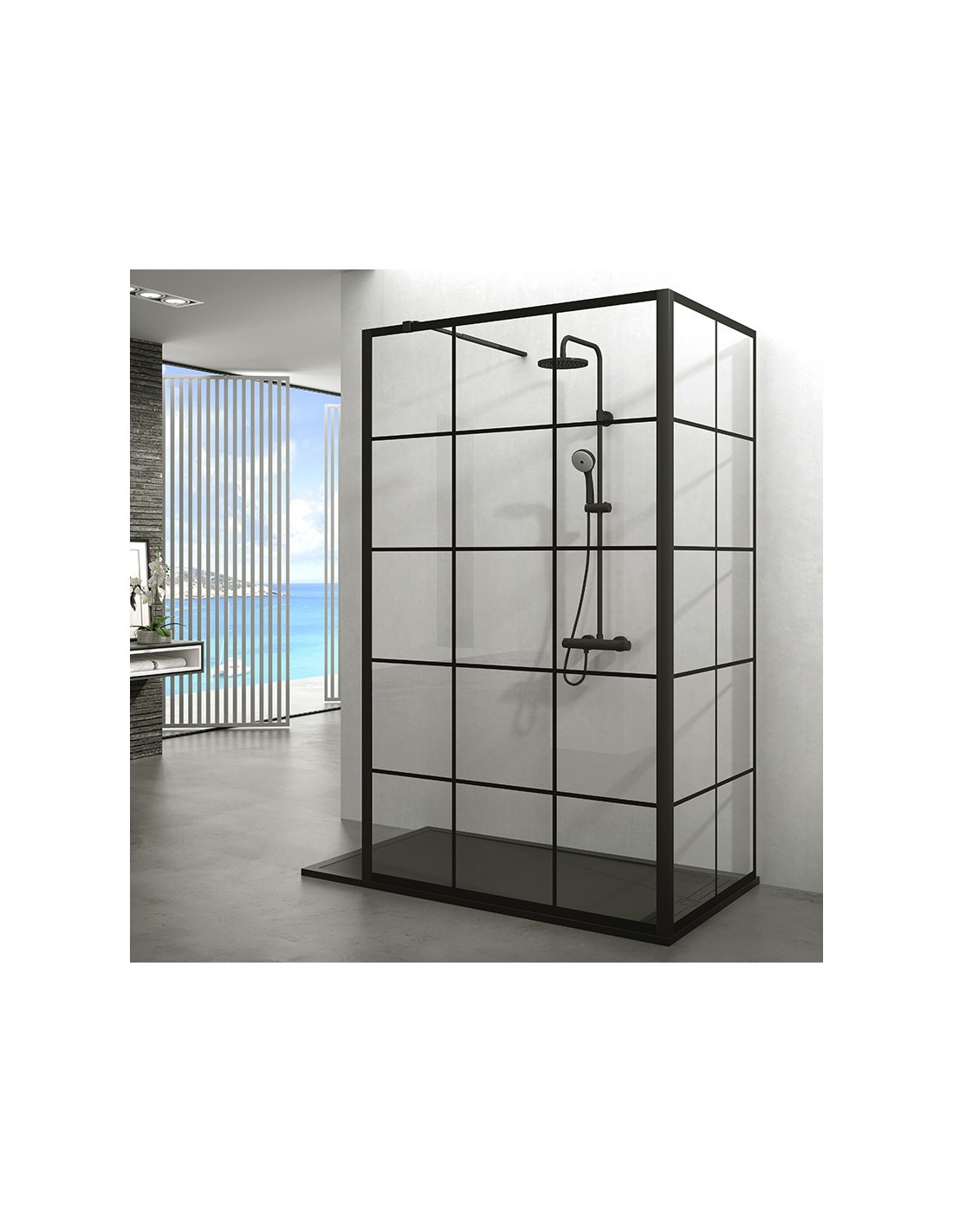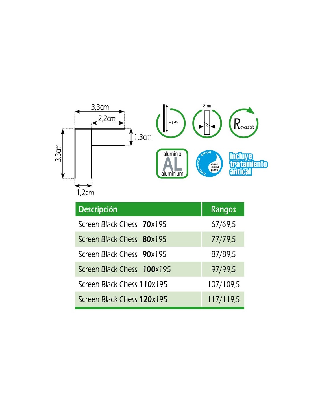 El modelo SCREEN BLACK CHESS ANGULAR es un fijo de ducha compuesta por dos vidrio fijo de 8 mm unidos por un perfil en ángulo. Es un fijo de ducha simple pero funcional, que incorpora toda su perfilería en Negro mate. Este fijo cuenta con un nuevo decorado que ha sido referente en las principales ferias internacionales dentro de esta tipología de mampara.
