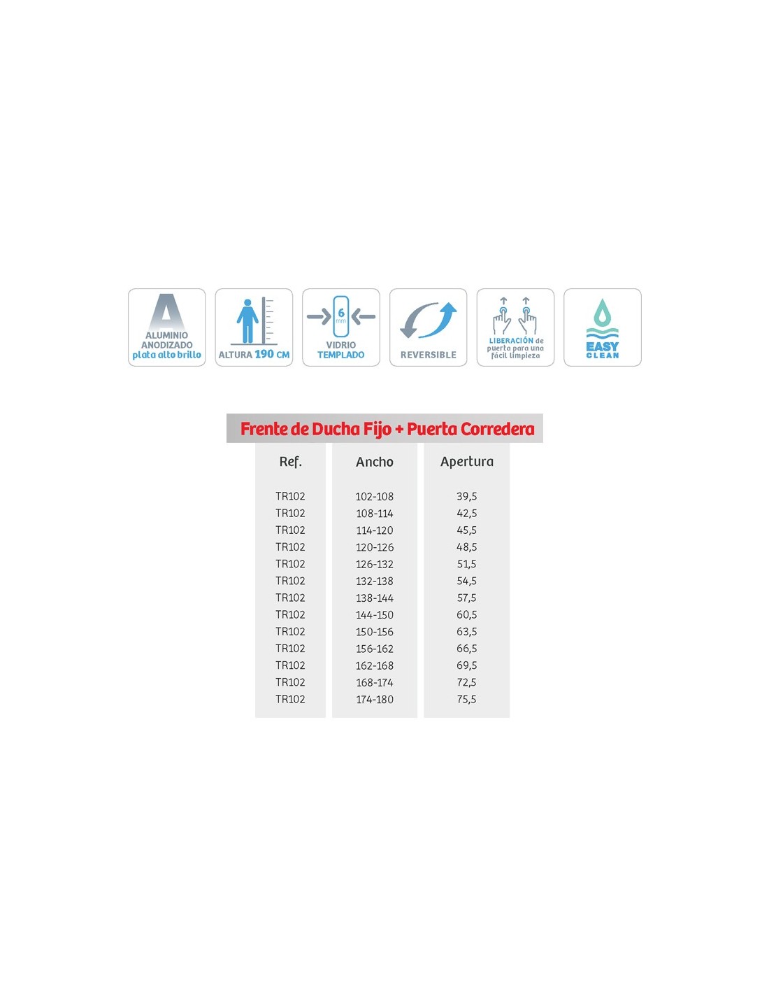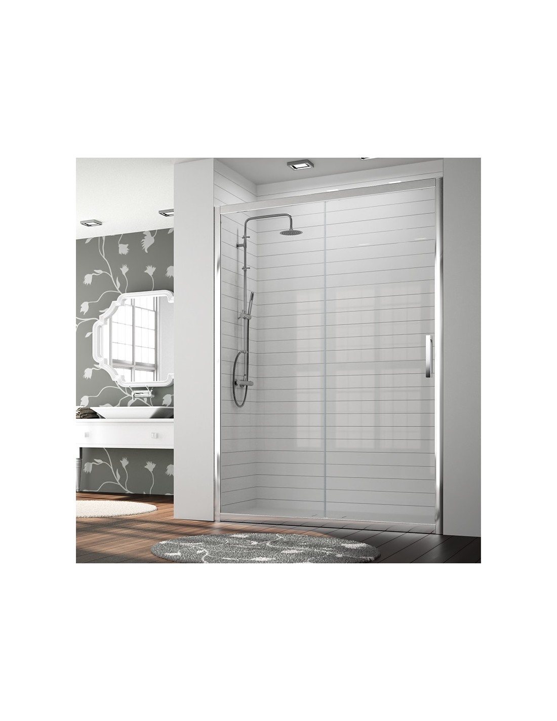 Mampara de ducha frontal de la serie 300 formada por un frente de ducha fijo + una puerta corredera. Disponible en gran variedad de rangos y diferentes , con vidrios de 6 mm y con Antical Estándar incluido.