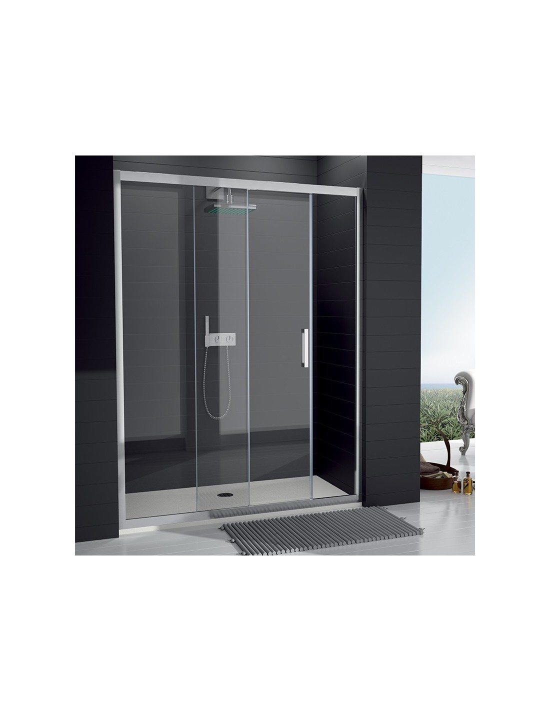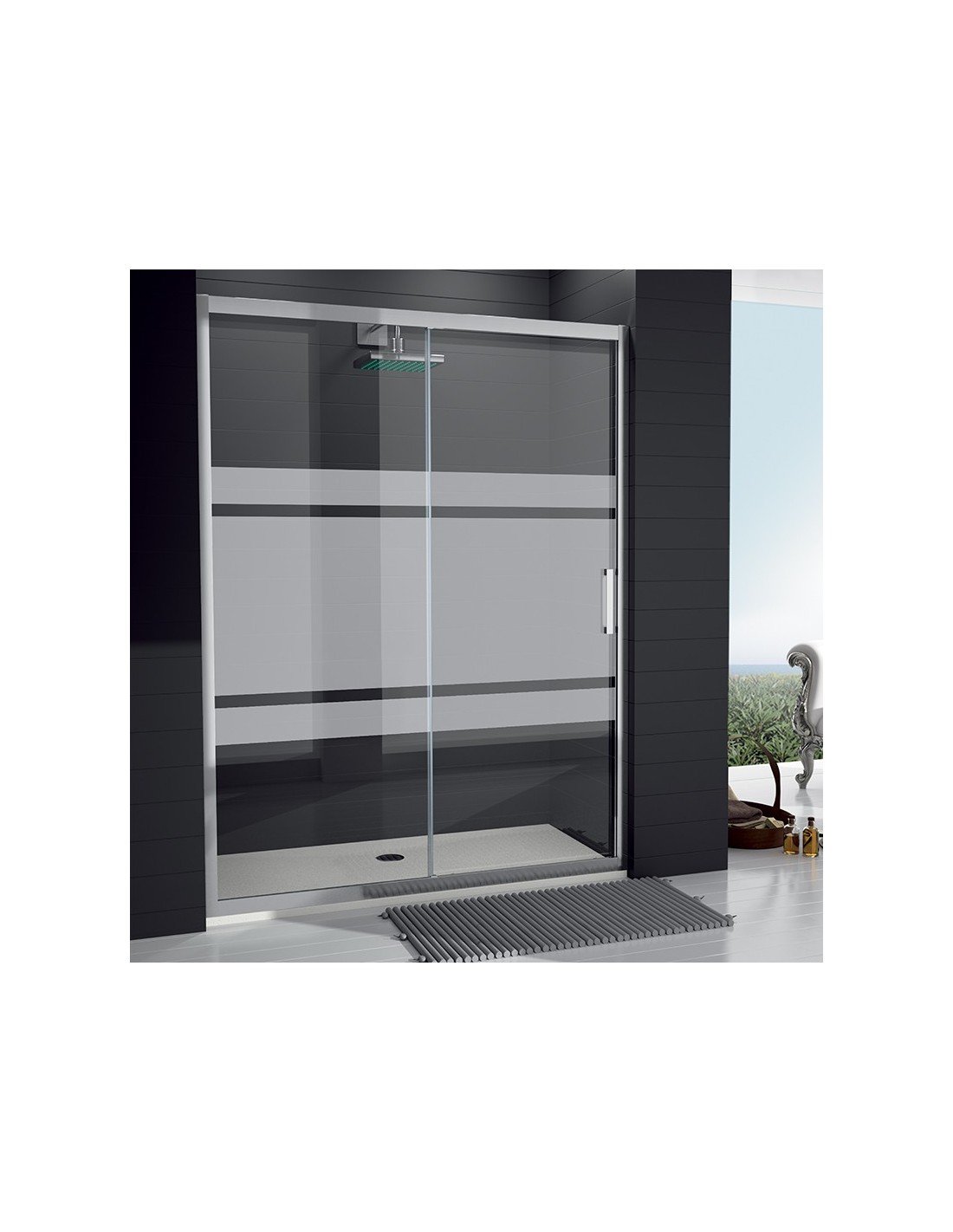 Dentro de la serie 300 encontramos el modelo que combina frente de ducha fijo + una puerta corredera. Su perfilería de aluminio anonizado tiene un acabado plata alto brillo. Además tiene la posibilidad de personalizarse con la serigrafía Bali, y dentro del precio viene incluido su tratamiento EASY CLEAN.