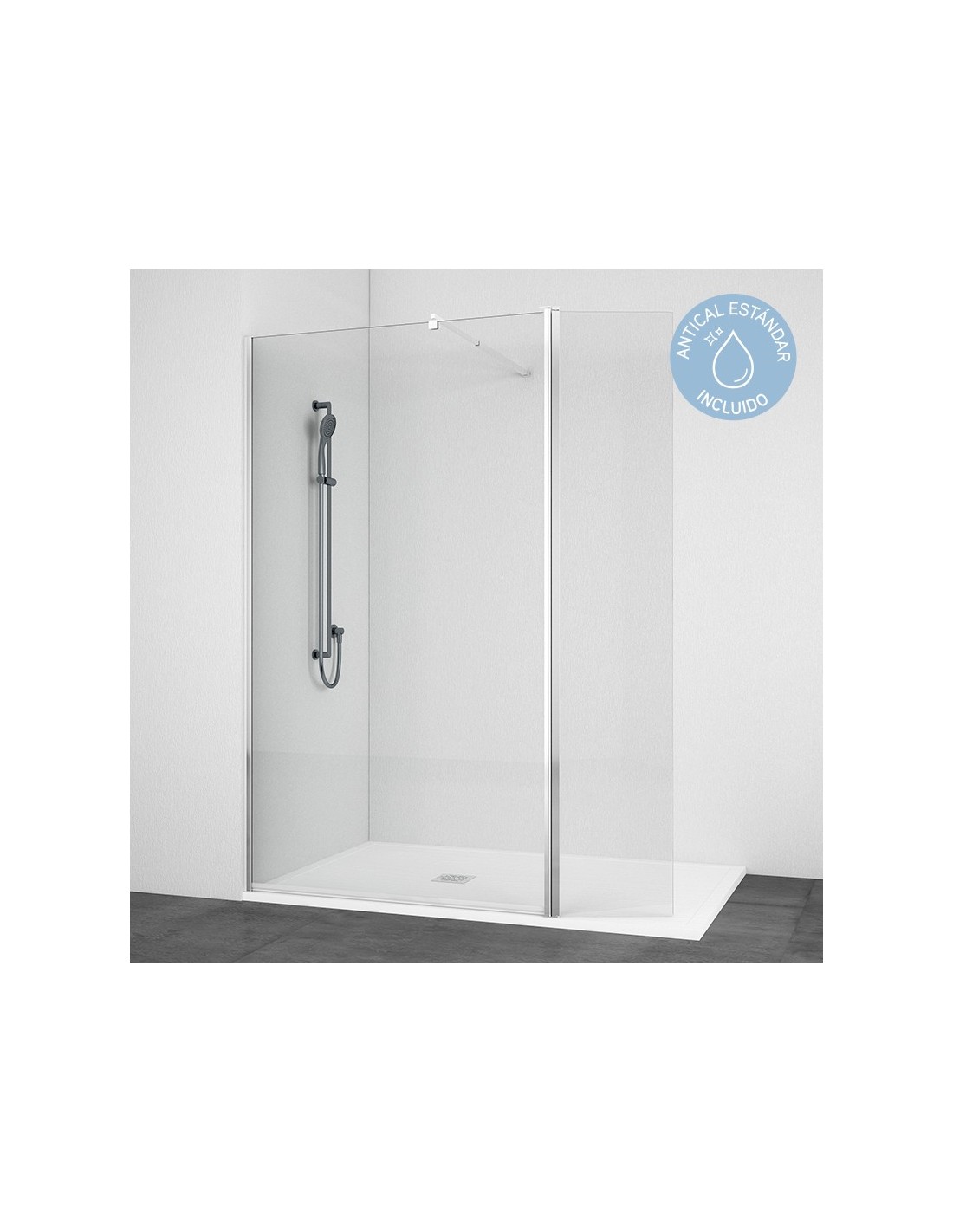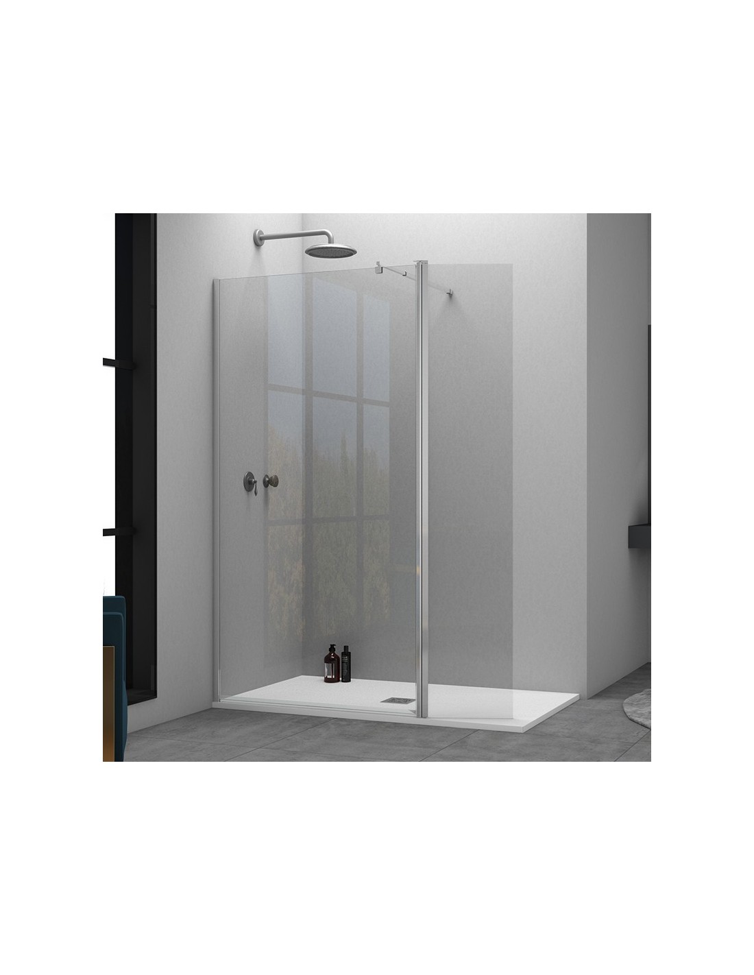 Fijo de ducha en stock. Diseño compuesto por un vidrio fijo de 8mm de espesor y una puerta abatible de 6mm. Su servicio es inmediato. Su acabado se puede encontrar en cromo.