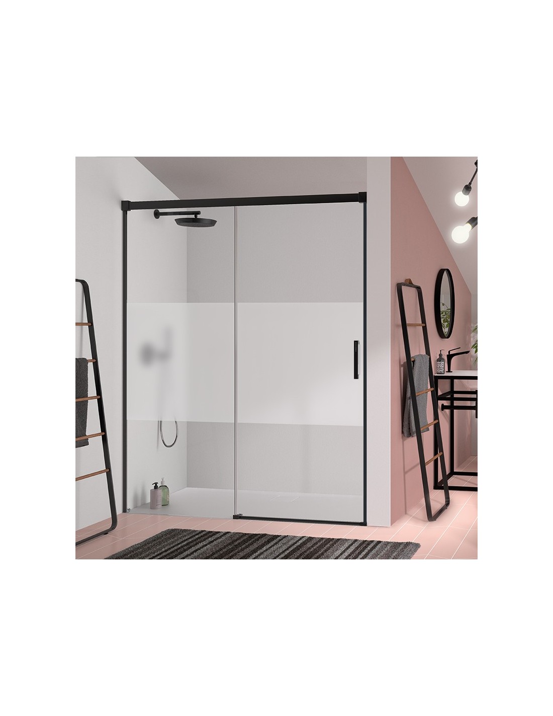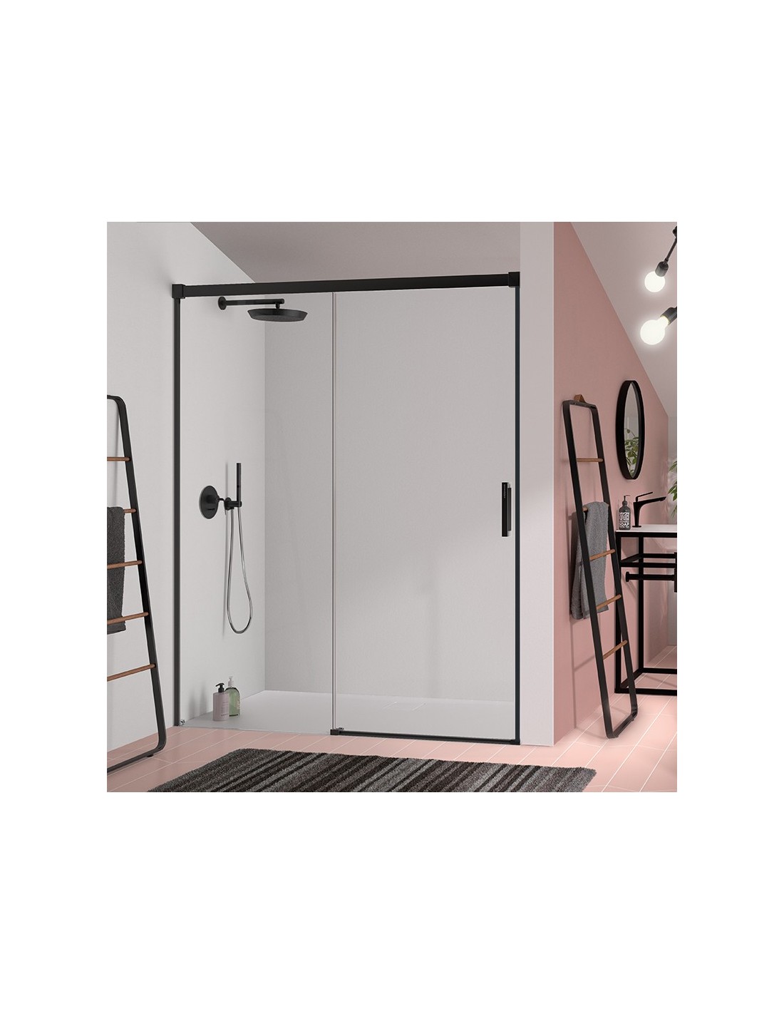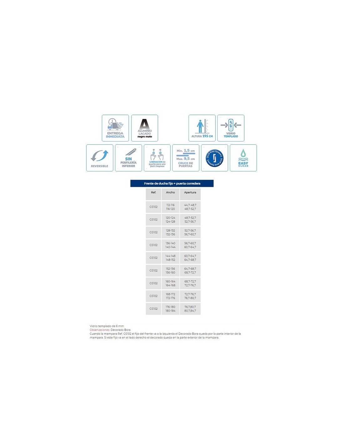 Mampara para ducha frontal Glasé. Frente de ducha compuesto por un panel fijo + una puerta corredera. Su perfilería de aluminio anonizado tiene un acabado Negro mate y su diseño cuenta sin perfilería inferior. En su diseño destacan su fácil liberación de hoja que permite una mayor limpieza. Incluido su tratamiento EASY CLEAN.