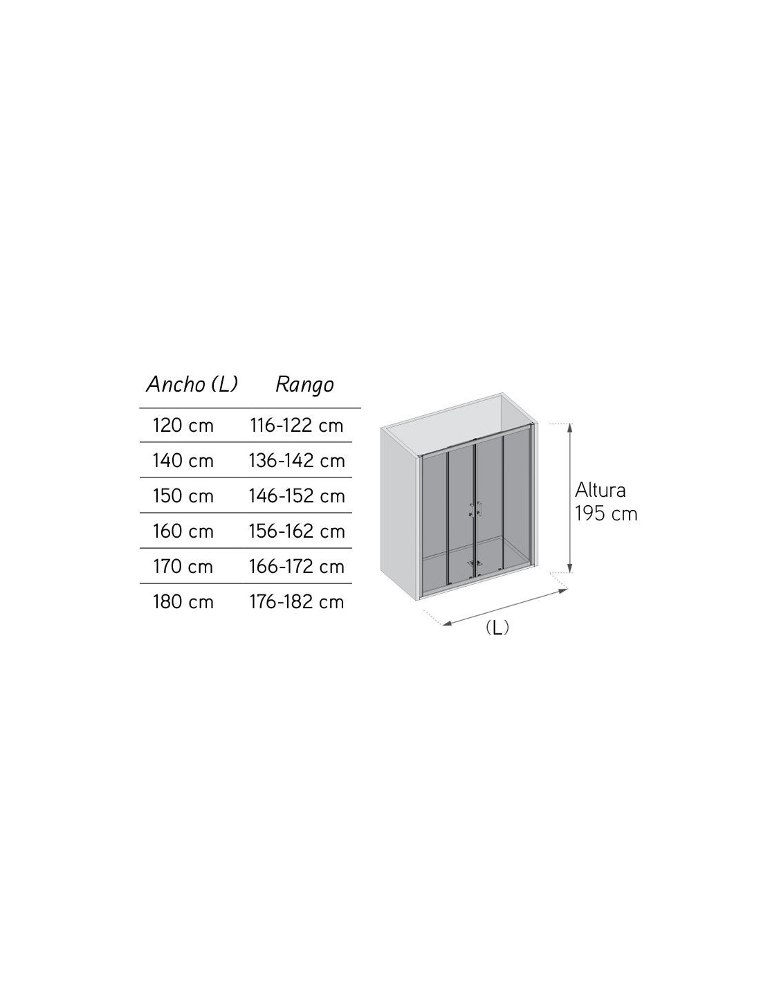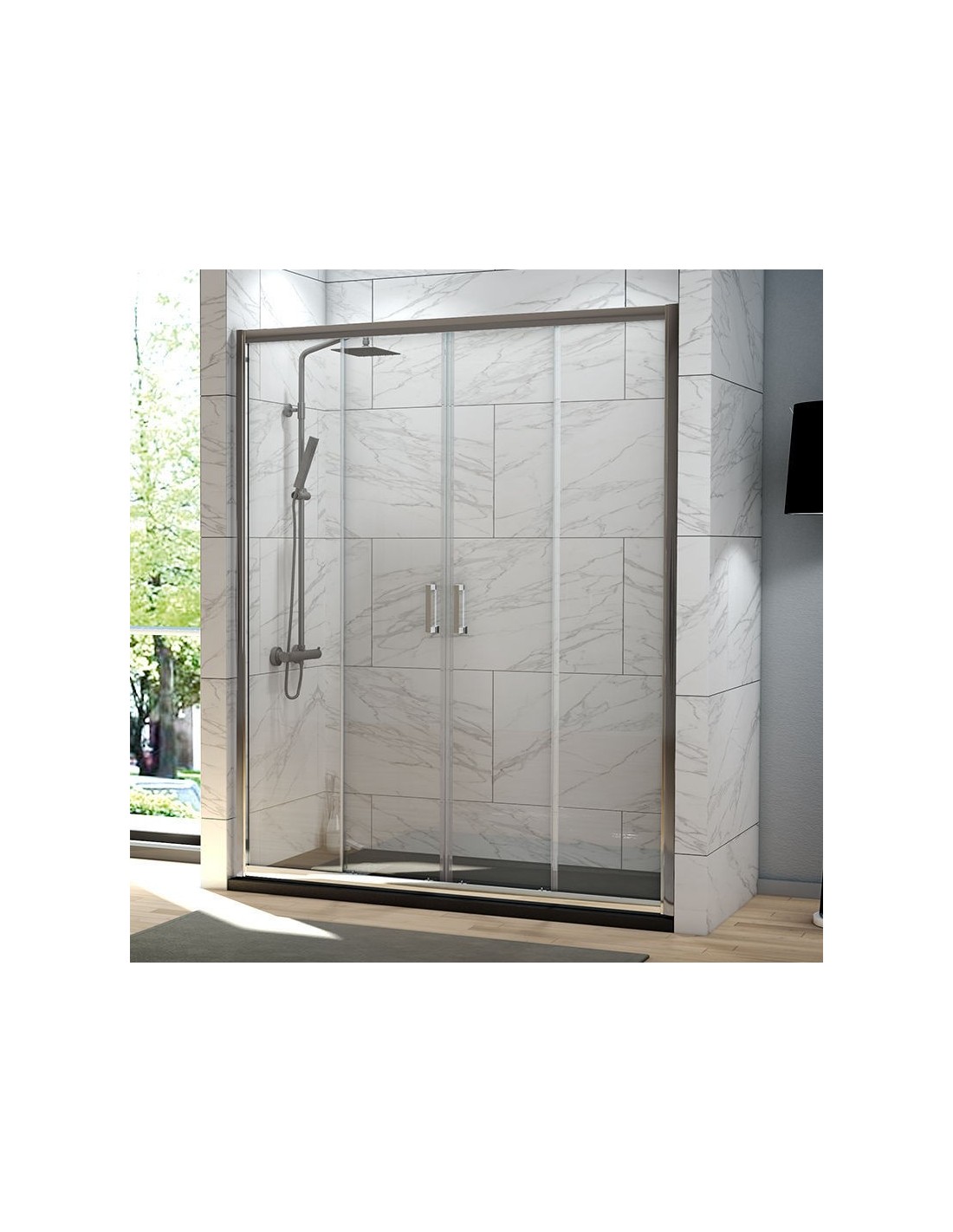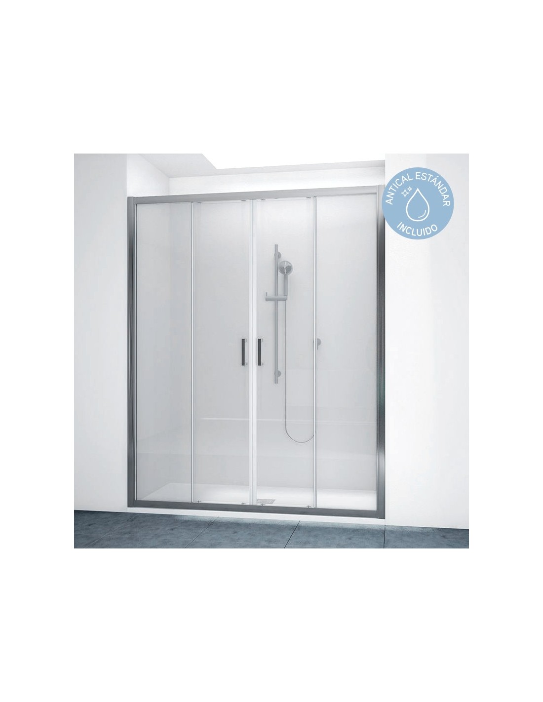 Mampara de ducha frontal diseñada con dos hojas centrales deslizantes y dos paneles fijos en los extremos. El vidrio es de 6 mm, con perfilería en cromo y acabado transparente o serigrafiado. Antical estándar incluido