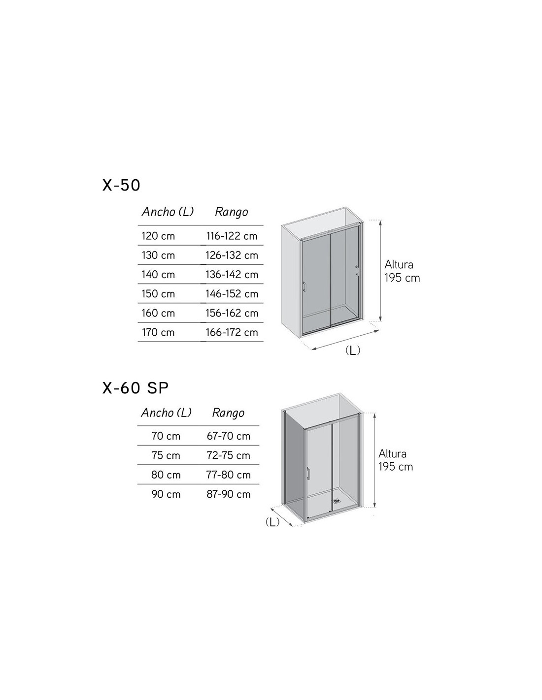 Combinación entre el modelos de mampara de ducha estándar X-50 y el fijo de ducha en ángulo X-60SP. Su perfilería tiene un acabado cromo y el vidrio puede ser transparente o a elegir entre tres serigrafías: Band, Band 2 y Medium. Está fabricado en su totalidad con vidrio templado de 6 mm, y su diseño es reversible, es decir, se puede instalar tanto a la derecha como a la izquierdas de la mampara de ducha.