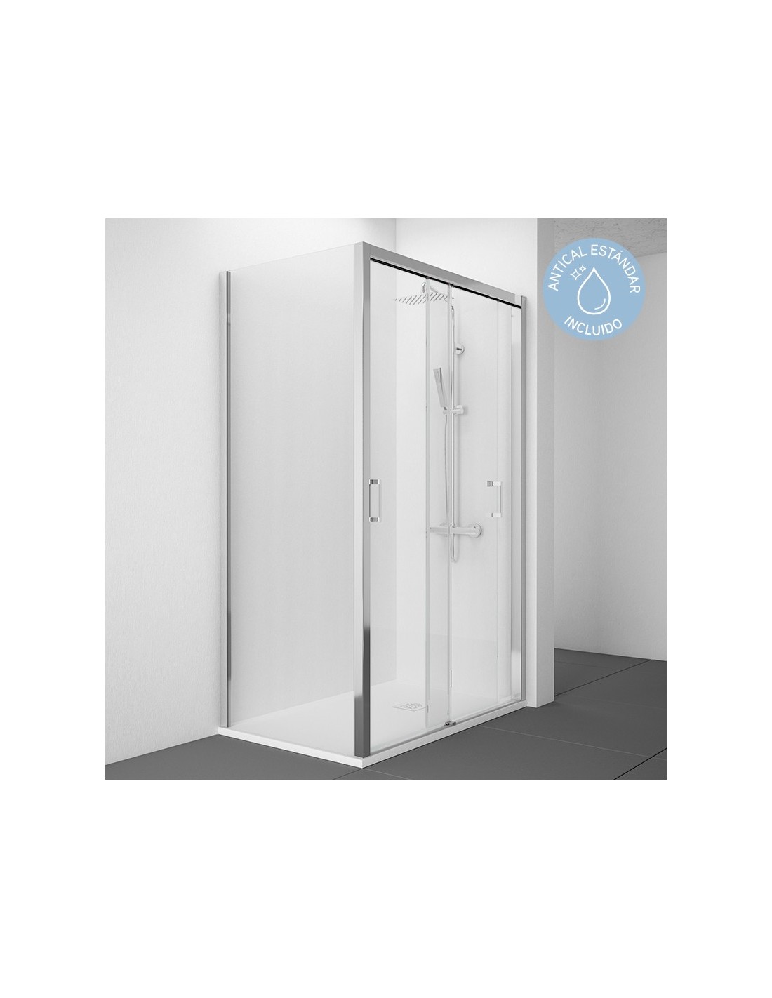 Mampara de ducha estándar X-50 con dos puertas de vidrio combinada con el fijo de ducha en ángulo X60SP. Su posición es reversible, con perfilería en cromo y acabados en transparente o serigrafía. Antical estándar incluido