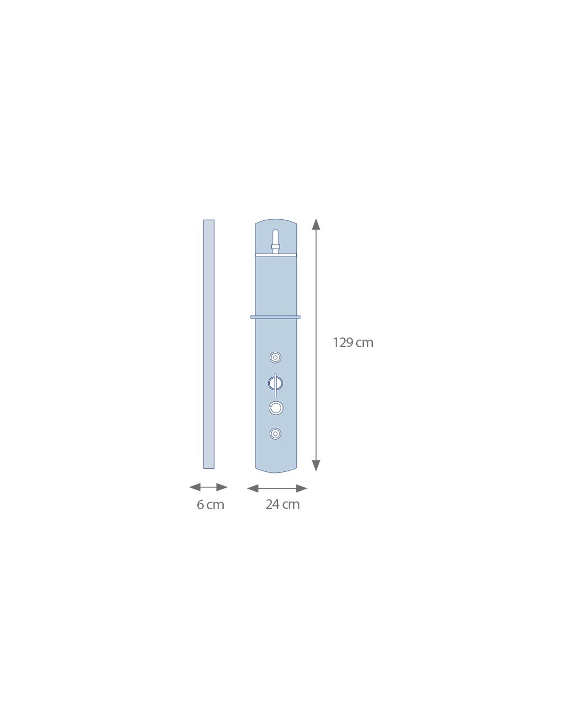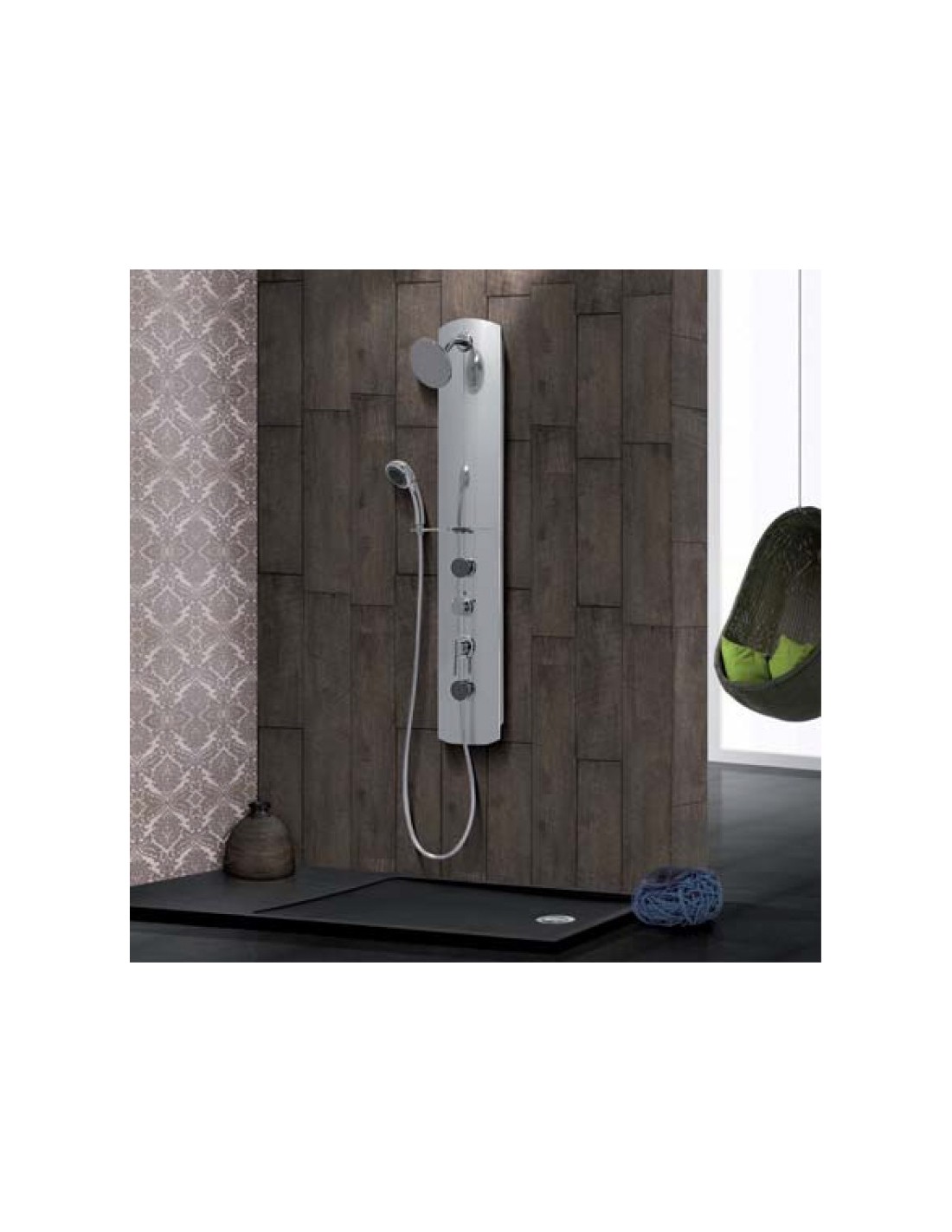 Columna de hidromasaje fabricada en aluminio. Incorpora mezclador monomando de 3 posiciones, un rociador superior de alto caudal (fabricado en latón) y teleducha de 3 posiciones. En su estructura añade un estante portaobjetos y dos miniduchas horizontales. Montaje a pared y latiguillos de conexión.