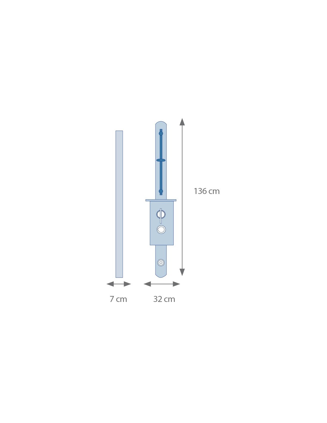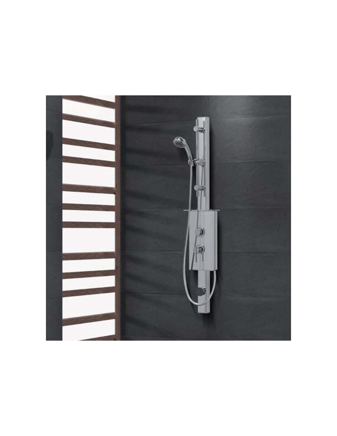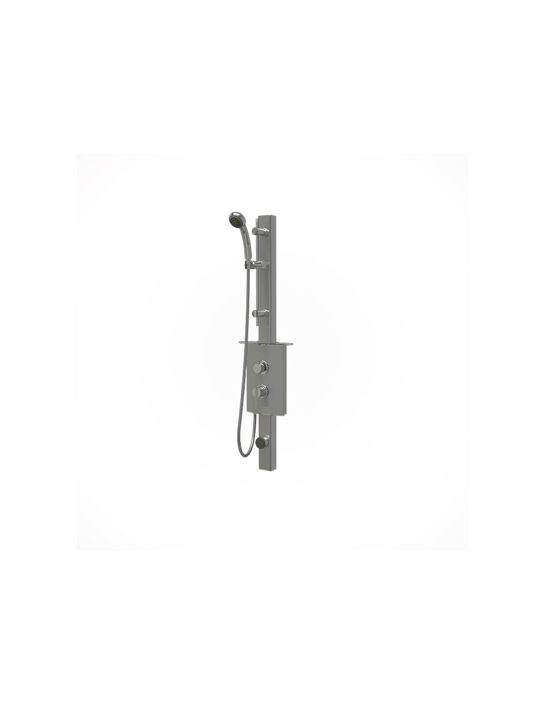 Columna de hidromasaje fabricada en aluminio. Incorpora mezclador monomando de 3 posiciones, un rociador superior de alto caudal (fabricado en latón) y teleducha de 3 posiciones. En su estructura añade un estante portaobjetos y dos miniduchas horizontales. Montaje a pared y latiguillos de conexión.