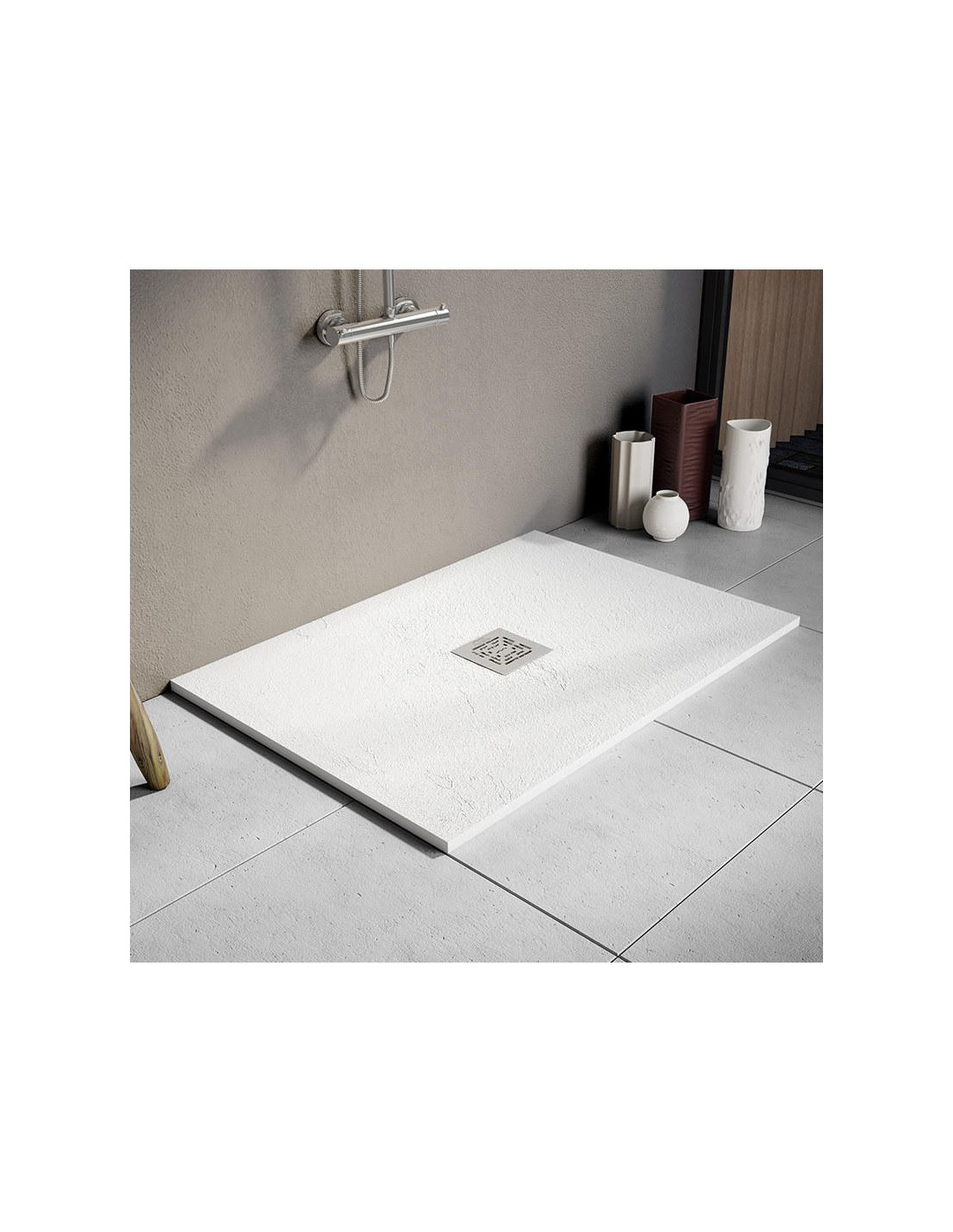 Plato de ducha extraplano con válvula centrada, en acabado blanco y textura pizarra. Fabricado con el material ST-ONE, con superficie antideslizante y antibacteriana. Servicio express. Varias medidas en ancho y largo.