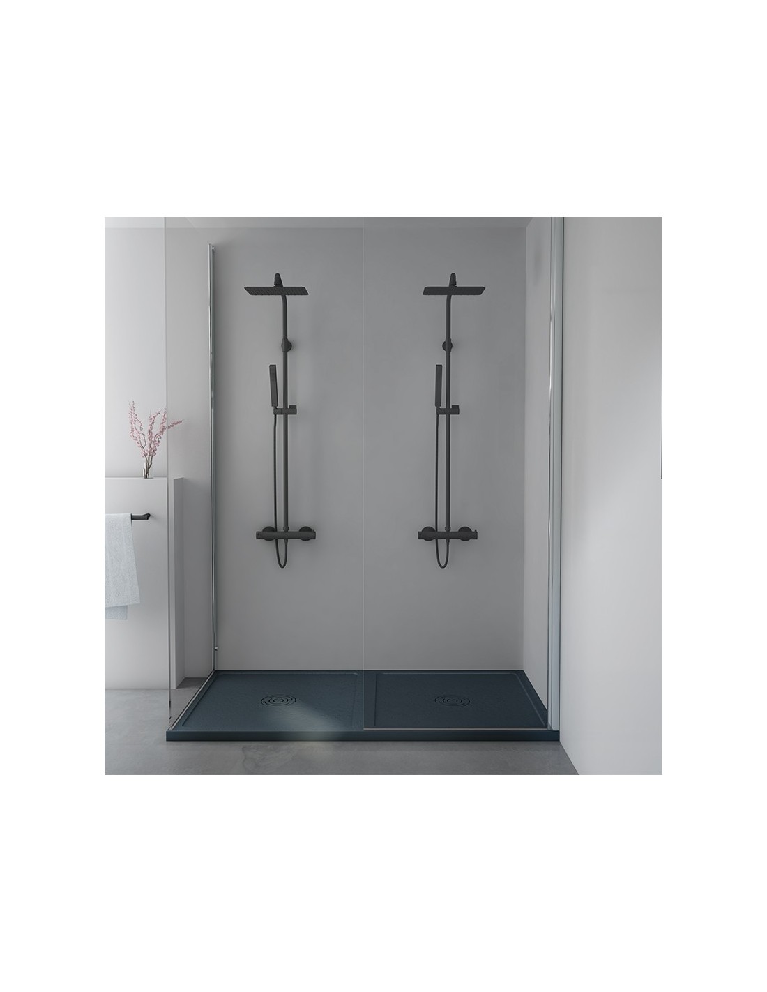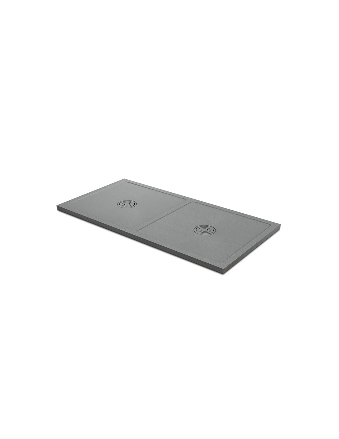 Plato de ducha Unic, con doble zona de ducha colocada de manera personalizada. Acabados en 10 colores y 8 texturas estándar. Fabricado con ST-ONE, una resina con carga mineral. Superficie con tratamiento antideslizante y antibacteriano. Rejilla integrada.